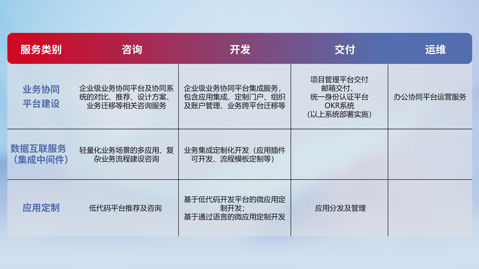 针对钉钉、、、企微、、、IDaas等平台级产品提供产品的规划、、、方案、、、交付、、、定制化开发等服务,,,,实现如统一协同办公、、智能客户服务、、、混合会议管理、、、、智能数据查询、、、、等业务场景,,实现数字化转型。。。。